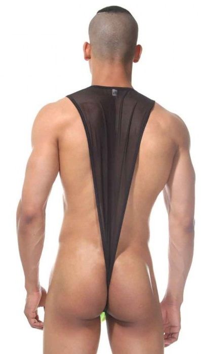 Оригинальное боди для мужчин, в котором скомбинирована верхняя полупрозрачная с контрастным гульфиком.
