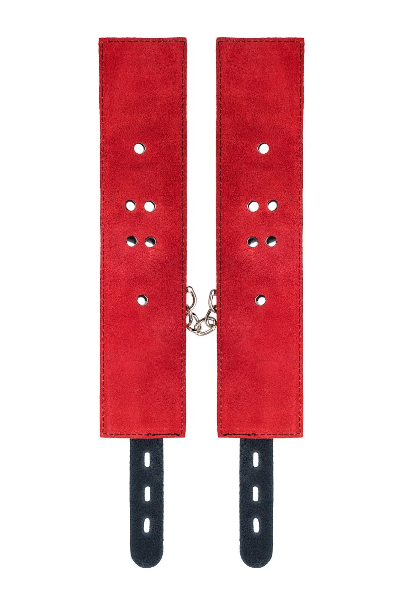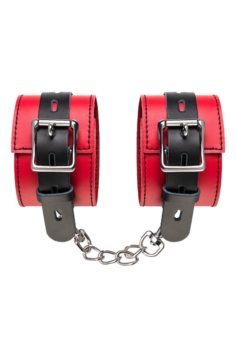 Оковы на ноги - волнующий воображение аксессуар, ведь это способ зафиксировать ноги партнера и получить полный доступ к его телу. Оковы из мягкой натуральной кожи сочетают в себе элементы, возбуждающие страсть и фантазию: красный и черный цвета и отделка металлическими элементами. В них будет комфортно подчиняться и ощущать ограничение свободы действий. Не натирают и имеют надежную степень фиксации. Размер легко регулируется металлической пряжкой. С помощью металлической цепочки и карабинов можно фиксировать ноги вместе, либо дополнить игру цепочкой и сковать ноги в широко разведенном положении. Длина манжет - 28 см., ширина - 6 см. Длина сцепки - 15,5 см.