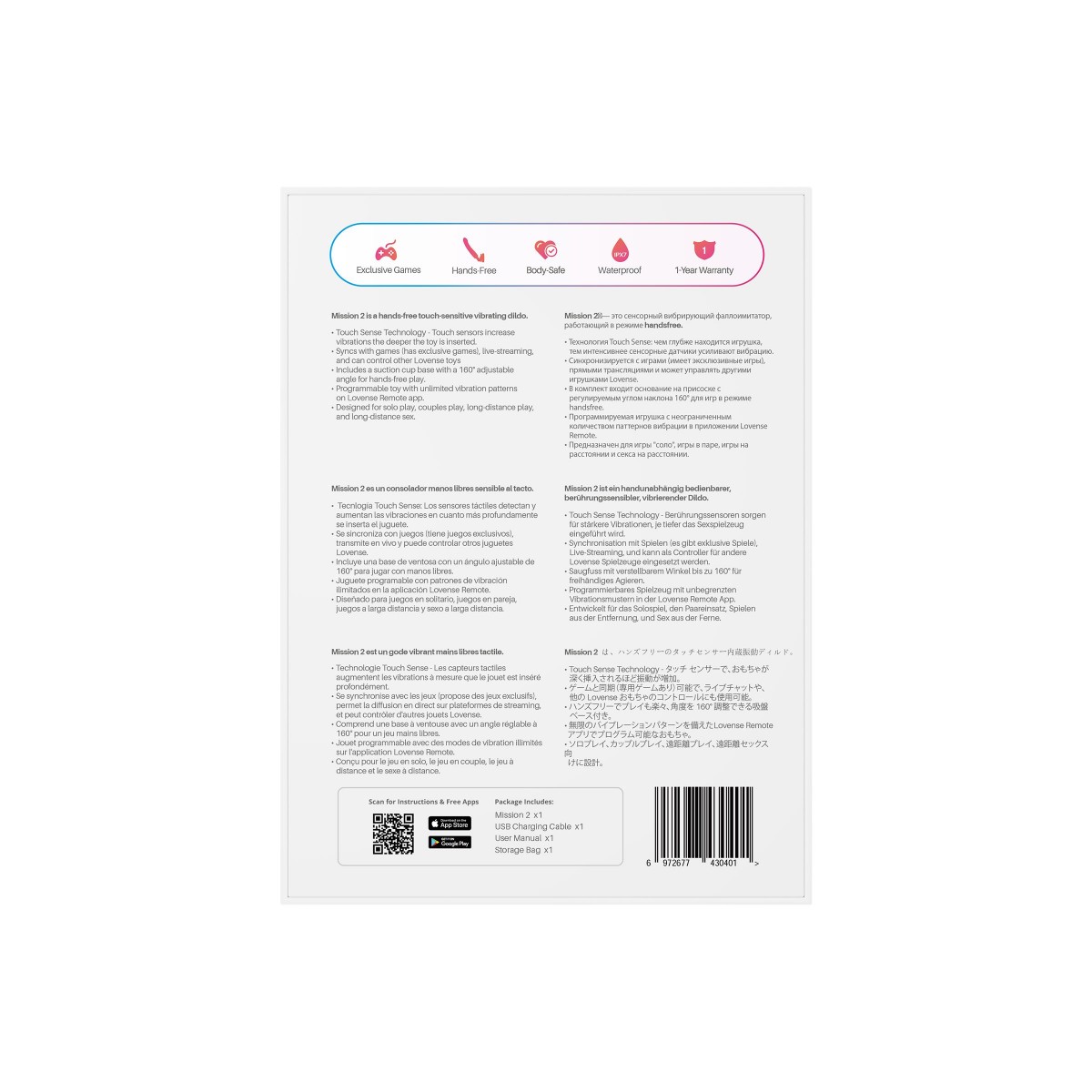 Откройте для себя новое измерение удовольствия с Mission 2 от Lovense — вибрирующим дилдо, который объединяет мощную вибрацию и уникальную технологию Touch-Sense. Его ультрамягкий кончик и ребристое покрытие созданы для того, чтобы обеспечивать мощную и комфортную стимуляцию точки G. Это идеальный выбор для тех, кто ищет интенсивные вибрации, удобство использования и возможность контролировать все через приложение. Технология Touch-Sense: вибрации, реагирующие на ваши движения. Благодаря инновационной технологии Touch-Sense от Lovense, интенсивность вибраций увеличивается по мере того, как вы вводите Mission 2 глубже. Это обеспечивает уникальный и плавный рост стимуляции, который усиливает ощущения и делает оргазмы еще ярче. Чем глубже вы погружаете игрушку, тем более мощные вибрации вы испытываете. Mission 2 не просто вибрирует — он реагирует на ваши действия, делая каждую минуту более чувственной и насыщенной. Присоска и регулируемый угол наклона для handsfree-использования. Mission 2 оснащен прочным основанием с регулируемой на 160° присоской, что позволяет зафиксировать его на любой гладкой поверхности. Наслаждайтесь handsfree-игрой, исследуя новые позы и уголки наслаждения – будь то горизонтальная или вертикальная позиция. Гибкость присоски делает использование Mission 2 простым и удобным в любых обстоятельствах: на полу, в ванной или даже перед зеркалом. Синхронизируйте Mission 2 с приложением Lovense Remote, чтобы управлять устройством на близком и дальнем расстоянии, создавая свои собственные паттерны вибраций. Более того, сенсорное управление позволяет играть в интерактивные игры, например, Flappy Jumpy, где движения дилдо синхронизируются с управлением персонажа в игре. Погружайтесь в мир игр и удовольствия одновременно — с Mission 2 возможно все. Отличный выбор для стримов и вебкам-сессий. Mission 2 создан не только для индивидуального удовольствия, но и для интерактивного взаимодействия с аудиторией. Игрушка идеально подходит для стримов и вебкам-сессий, позволяя синхронизировать вибрации с движениями и усиливать связь с вашими зрителями или клиентами. Чем интенсивнее вы используете игрушку, тем более мощные ощущения испытывают подключенные клиенты или зрители, создавая неповторимую интерактивную атмосферу. Надежный, водонепроницаемый и безопасный для здоровья. Mission 2 полностью водонепроницаем по стандарту IPX7, что позволяет использовать его в душе или ванне, а также легко чистить после использования. Выполненный из безопасного для тела силикона и устойчивого поликарбоната, он не содержит вредных веществ и фталатов, что делает его полностью безопасным для вашего здоровья Рабочая длина - 14 см.