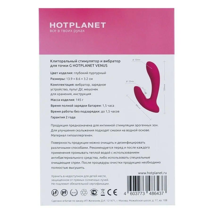 Hot Planet Venus — игрушка, стимулирующая сразу две чувствительные зоны. Вибрация воздействует на точку G, а вакуумно-волновая стимуляция — на клитор. У Venus два мощных мотора, которые управляются независимо друг от друга. Выбор за вами: наслаждайтесь чем-то одним или комбинируйте разные виды стимуляции так, как нравится именно вам. Hot Planet Venus позволяет получить оргазм в любом месте и в любое время: благодаря своему небольшому размеру, игрушка может быть использована когда и где угодно. Изогнутая форма Venus идеально подходит для интенсивной внутренней стимуляции, а гибкость вагинального отростка позволяет подстраивать игрушку под индивидуальные особенности тела. Вибратор полностью водонепроницаем и сделан из высококачественного медицинского силикона, за которым легко ухаживать. Venus очень просто управлять. Для включения или выключения игрушки нажмите и удерживайте кнопку питания в течение нескольких секунд, пока не загорится световой индикатор. Это сигнал, что игрушка перешла в режим ожидания. Теперь можно переключать режимы вибрации и клиторальной стимуляции коротким нажатием кнопок. Кнопка питания отвечает за режимы вакуумно-волновой стимуляции, а вторая кнопка с изображением волны управляет вибрацией. При нажатии кнопок во время работы девятого режима любого стимулятора, игрушка переводит соответствующую часть в режим ожидания. Т.е., если вы хотите оставить включенной только вибрацию, просто коротко нажимайте на кнопку управления вакуумной стимуляцией, чтобы дойти до режима ожидания. Для использования с пультом ДУ сначала включите игрушку с помощью кнопки на её корпусе. Когда игрушка включена, вы можете включить пульт долгим нажатием на кнопку питания на нем и переключать режимы работы стимуляторов так же, как делали бы это с помощью кнопок на самой игрушке. Когда вы закончите, выключите и пульт, и игрушку долгими нажатиями на их кнопки питания. При выключении Venus с пульта ДУ, игрушка переходит в режим ожидания на 5 минут. Это значит, что в течение 5 минут стимулятор можно снова включить, используя только пульт. Через 5 минут ожидания Venus и пульт ДУ автоматически выключаются, и для повторного включения требуется нажать кнопку на корпусе игрушки. Пульт ДУ также имеет аккумулятор и заряжается от сети, благодаря чему вам не придется менять батарейки.